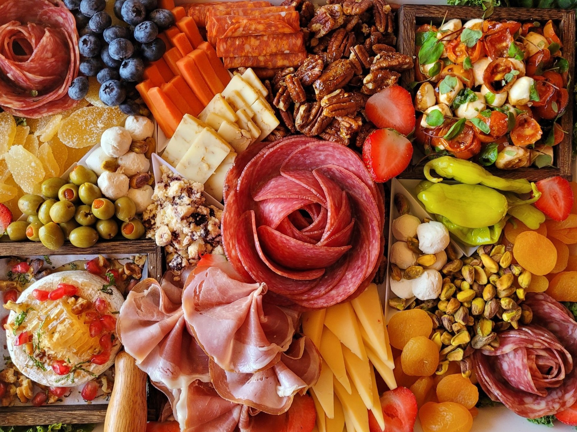 Cured meats, various cheeses, nuts, spreads & dips, and more